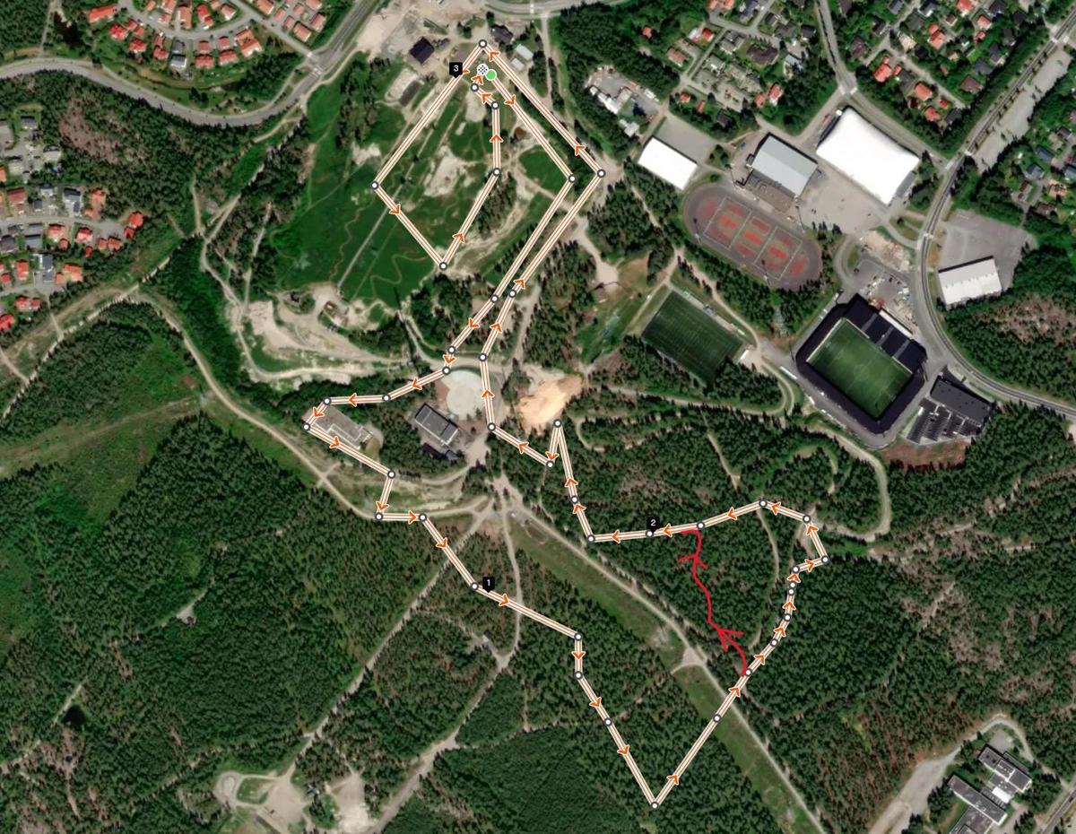 Ensimmäisen lähdön lyhempi reitti on teknisesti helpompi ja se soveltuu siten hyvin myös aloitteleville junioreille. Punaisella merkittynä oikaisu (lyhennetty reitti).