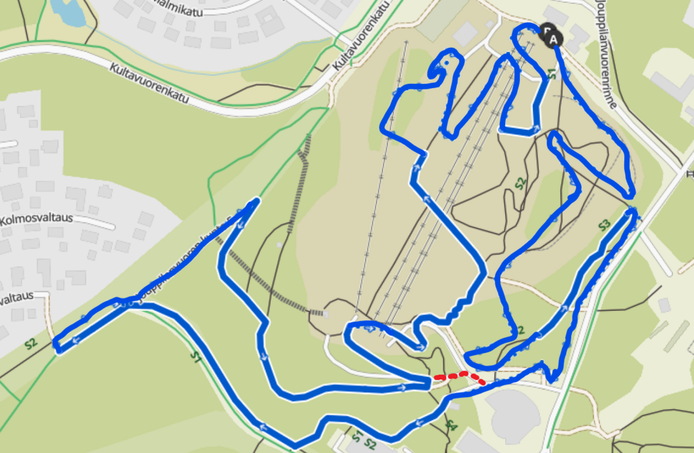 Nuorten (U11-U13) rata oikaisee punaisella merkattua linjaa.